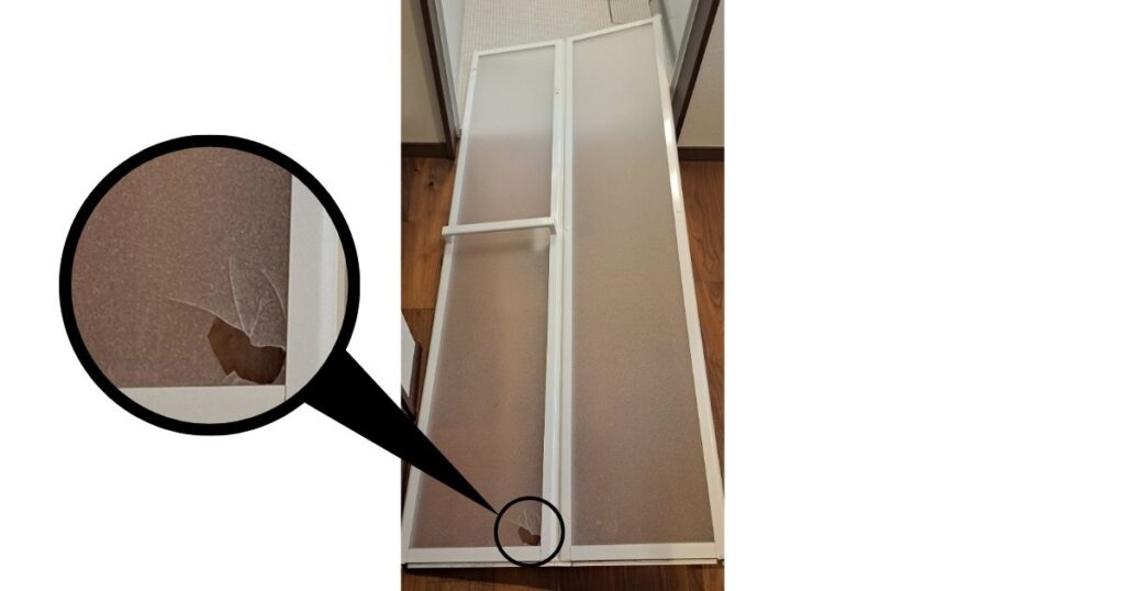 調べてみると、TOTOの浴室ドアはアクリルパネルが接着されているようです。