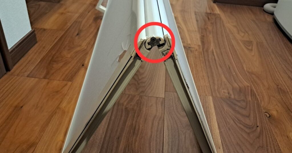 写真の赤丸部分の金具を外せば、連結金具をスライドして外すことが出来ます。